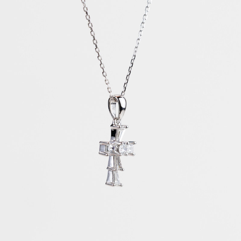A delicate 18K white gold diamond pendant featuring one rose-cut diamond (0.06cts.) and five trapezoid-cut diamonds (0.22cts. total). Weight: 0.82 g.