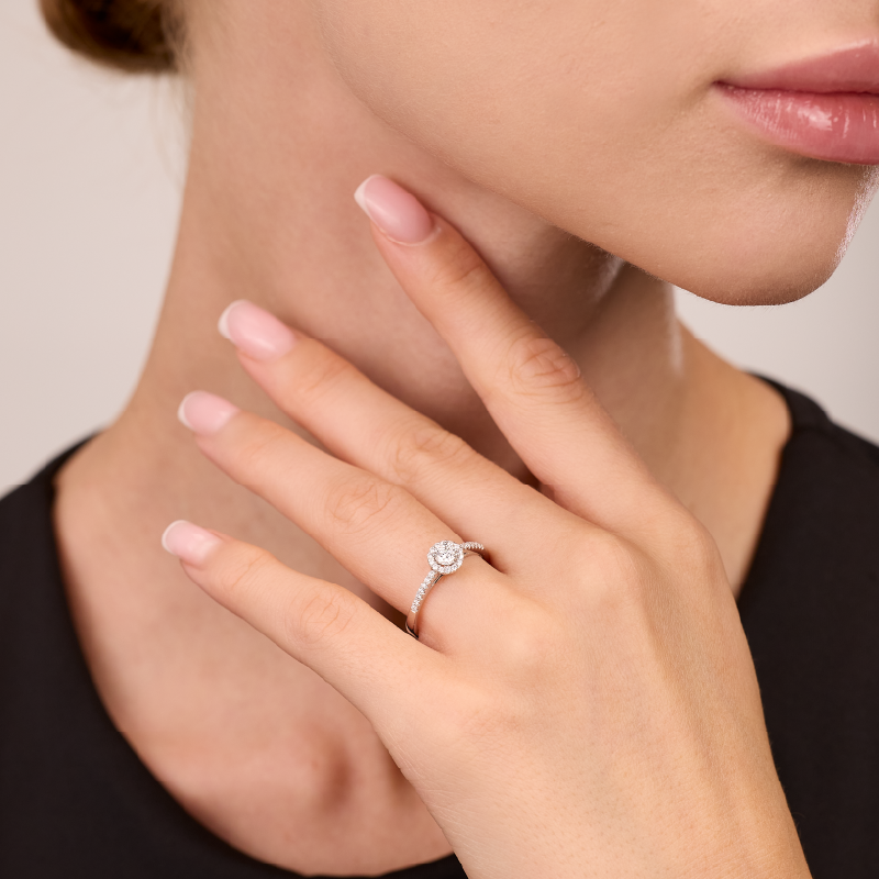 An alluring 18K white gold ring featuring a main stone and a 0.27 carat round diamond, enhanced by 28 additional round diamonds weighing approximately 0.18 carats.